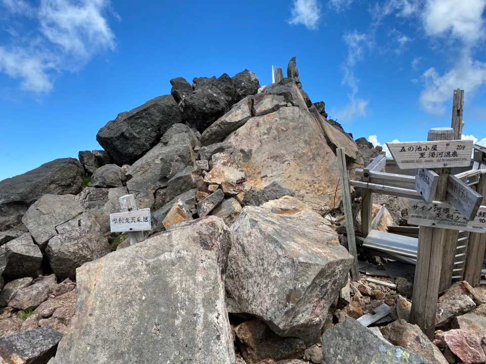 今回は、数ある御嶽山の登山コースの中から濁河温泉登山口を起点とする飛騨小坂口登山道を辿り、五ノ池小屋(飛騨頂上)を拠点として、剣ヶ峰、摩利支天、継子岳(含む継子Ⅱ峰)の三峰(注1)と、一ノ池〜五ノ池までの全ての池を周遊する1泊2日のグループ登山に挑戦してきました。  (注1)御嶽山の山頂部は4つの峰から構成されていますが、その一つである継母岳は現在通行禁止となっています。 今回は摩利支天から継母岳の眺望もしっかり眺めることができました。 個人的に山小屋利用は初めてで、グループ登山もYamapを始めて以降は初体験となります。 【今回の2日間のコース概要】 以下のとおりです。 本活動レポでは、1日目のみを収録しております。  2日目の山行については、2日目の活動レポをご参照ください。 御嶽山 グループ登山&山小屋初体験 二日目 @五ノ池小屋泊(飛騨頂上・継子岳) https://yamap.com/users/1271157 (1)1日目: 濁河温泉登山口🅿️から五ノ池小屋まで登り、昼食後大きな荷物をデポした後、五ノ池小屋〜剣ヶ峰間をピストン⇆をベースとしつつ、復路は途中、摩利支天に立ち寄った後、五ノ池小屋に戻るルートとしました。 (2)2日目: 四ノ池、三の池を巡る以下の時計回りの周回コース↩️とし、その後、濁河温泉登山口🅿️へ下山するコースとしました。 五ノ池小屋→継子岳→継子II峰→三ノ池避難小屋→五ノ池小屋 【所感】 (1)お山⛰について ①御嶽山の内、主峰の剣ヶ峰(注2)と第2峰の摩利支天については、昨年夏に続き2回目の登頂になりますが、継子岳については今回が初めてになります。 また、5つある池についても、前回は天候の関係でニノ池と三ノ池しか見られませんでしたが、今回は一ノ池〜五ノ池までの全ての池を見ることができ、とても満足しています。 (注2)ニノ池山荘の先、黒沢十字路〜剣ヶ峰間はヘルメット着用が義務付けられています。 忘れないようにご注意ください。 ②1日目の上りは濁河温泉登山口〜8合目までYamapを起動し損ねてしまった(活動開始ボタンを押したつもりがきちんと押せておらず、起動していなかった模様)ため、その間の山行軌跡の記録は残っておらず、おかしな累積標高差となっています。  実際には濁河温泉登山口を7時20分くらいに出発しています。 (2)高山植物について ①一番感動したのは、高山植物の女王、アルプスの女王と呼ばれる「初コマクサ」が見られたことです。 特に、継子岳から継子Ⅱ峰の間にある大群落はその規模もとても見事なもので、感動🥺いたしました。 コマクサは今がピークのように見えました。   ➡️継子岳のレポについては2日目の山行レポをご参照ください。(1日目終了時にYamapを終了してしまい、別のレポにせざるを得なくなってしまいました😵) ②コマクサ以外にも、オンタデ、ミヤマダイコンソウ、ミヤマキンバイ、チングルマ、イワウメ、オオヒョウタンボク、モミジカラマツ、ゴゼンタチバナ、アオノツガザクラ、ツガザクラ、イワカガミ等の色とりどりの高山植物を見ることができ、とても良い癒しの1日となりました。  詳細は一日目、二日目の各写真のキャプションをご覧ください。 (3)お天気と山の眺望について ①1日目は雲が動きが激しく、昼間は全体に曇り時々晴れのようなお天気で、山岳風景の眺望としては今ひとつでした。 1日目は富士山もアルプスも全く見えませんでした。 どのアルプスも山頂付近は雲がかかっているようでした。 ②初日の20時過ぎの時点では天頂周辺しか晴れ間がありませんでしたが、午前0時頃にトイレに行くために外に出てみると、何と南北に天の川がはっきりと見え、雲が全て消え去っていました。 夏の大三角形も天頂に移動し、琴座のベガ(織姫星)とわし座のアルタイル(彦星)の間を天の川が流れているのが明瞭にわかりました。 そこから1時間くらい飛騨頂上で仲間3人と天体ショー🌟を観測しました。  もともと星は好きな方ですが、こんな形で満点の星を眺めるなんて何十年ぶりだろうか? とすっかり学生時代に戻った気分になりました。  昔覚えた星座も多少は記憶の片隅にあって、また流れ星🌠や人工衛星も見えて、仲間と楽しいひと時を過ごせました。    深夜でしたが不思議と風もなく、インサレーションを羽織っていたこともありそれほど寒さも感じませんでした。 気温は10℃くらいだったと思います。 夜は防寒は必須です。 私は写真撮影できるものはi-phoneしか持ち合わせていなかったので、星の撮影は断念しました。  星は観測のみで撮影は本活動レポには含まれておりませんが、とても素晴らしい体験でした。  ➡️1日目の深夜から翌朝7時頃までは上空の雲が完全に晴れてくれたので、翌朝のご来光(4時45分くらい)の時は、雲海上に中央アルプス、南アルプスや富士山がはっきりと見えました。 中でも日本の高峰3山(富士山、北岳、間ノ岳)が同時に見渡せたのはとても感動🥺でした。 二日目の朝は白山も見渡せました。 北アルプスは、五の池小屋近くの飛騨頂上か