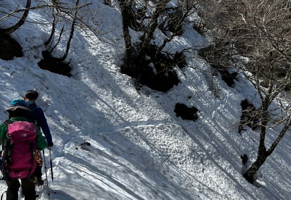 洞川温泉からすぐの母公堂の稲村ヶ岳駐車場から、法力峠~稲村小屋~稲村ヶ岳ピストン。雪はだいぶ解けましたが、稲村ヶ岳山頂直下の急坂は北斜面で結構雪が残りここは12本爪アイゼンを我々も他の登山者の方も装着してました。 法力峠~稲村小屋(1時間半) 稲村ヶ岳は、稲村小屋までは急な坂が無く非常に体力的にも登り易い反面、ずっと登り易さを考慮したトラバース構造なので、危険箇所も段々出てきています。今回も、1)滑りやすい大きな石の斜面(法力峠~稲村小屋の真ん中)と、2)足の置き場が非常に少ないトラバース(稲村小屋の手前)の2箇所が結構危険箇所かと思います。時々稲村のトラバースでは滑落事故のニュースも聞くので是非注意してください。 稲村小屋~大日山の取りつき(20分) ここもずっと大日山のトラバース。気を付けて行けば大丈夫です。2年前は12月の日が短い時期だった事もあり、ここで時間切れ撤退しました😂 大日山取りつき~稲村ヶ岳山頂(20分) ここからは少し急になります。この日は12本爪アイゼン装着、アイゼン持たない方は撤退されてました。 山上ヶ岳、大普賢岳、釈迦ヶ岳、奈良盆地や大和葛城・金剛山方面まで見渡せる景色も最高です。