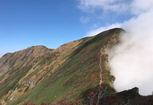 稜線の紅葉🍁はほぼ終わりです。オキ、トマまでは ガスガス。奥の院あたりからガスが晴れ、素晴らしい眺望がひらけました。