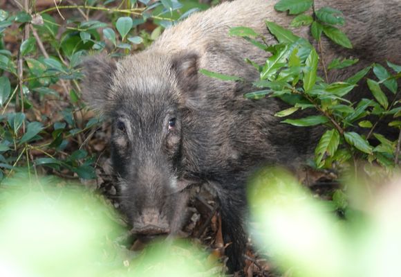 前日、いつもより早めに出かけたら、噴水の近くで、 うじゃうじゃと言いたくなるようなたくさんの小鳥に出会ったので、今日も早めに出かけたら、皆無でした。 天気のせいかな。鳥は羽があるからどこでも飛んでいくのは当たり前と、峠の展望所を目指します。 何か枯葉を踏むようなカサカサと音がするので、誰か登山者がいるものとおもってました。 展望所に行くと、やはりカサカサと音がします。 何かと覗いてみると、イノシシでした。 近い、近すぎる、5mくらいかな。 こちらが少し高いところから、柵、手すりも有るしと、一瞬にらみ合い、 こらっと怒鳴ると逃げて降りはじめました。 立ち止まったので、もう一度怒鳴ると、林の中に走って消えていきました。 何年かぶりの接近遭遇でした。 前回は町中で、追いかけられましたからね。・・・