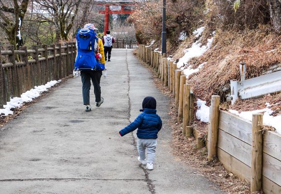 1歳児(生後14カ月)と一緒にハイキング、第10回目は御岳山、ロックガーデン。 御岳山は東京都の山だけど、高尾山よりもアクセスに時間を要する。都心から御嶽駅に行くだけでも時間を要する。早い時間帯に週末の「ホリデー快速おくたま」もあるのだが、人が多めの電車に1歳児を乗せたくはなく、都内の山にも関わらず、1泊ハイキングとした。御岳山には「講」があり、御師集落がある。宿坊がある。楽天トラベルで探すとちょうど1軒空きがあり、評価もかなり高そうな「南山荘」があった。ホームページも確認し、1歳児が泊まることに問題ないか念のため確認。お風呂は予約制の家族風呂になり、バンボがあるということで即1泊予約。 初日、自宅で朝ご飯や洗濯を済ませた後、2時間近くかけて電車で御嶽駅へ。12時過ぎ。お昼の時間。御嶽駅近くにある中華料理「東峯園」に入る。娘には和光堂栄養マルシェのベビーフード弁当とあわせて、親の五目焼きそばから錦糸卵、もやし、チャーシュー少々を持ってきたハサミで切って娘に食べてもらう。その後、青梅市御岳交流センターの多目的トイレを使わせてもらって娘のオムツ交換。13時台のバスに乗り、御岳山のケーブルカー乗り場へ。ここで娘はベビーキャリー上で入眠。ケーブルカーで上部の御岳平に到着したところで娘は覚醒。先日の雪が残ってた。気温低め。娘を抱っこすると体が震えてた。重ね着で厚着させ、御師集落を目指して娘自身を歩かせる。歩かせて体を温めてもらう。山道でなく平坦道なので1歳児でも歩ける。時折抱っこして進んだり、娘を歩かせるという時間のかかる行程で御師集落へ。御師集落もしばらく歩くが、坂道が多くなる。娘をベビーキャリアに乗せ、先へ進む。宿泊予約した「南山荘」の場所を確認しつつ、御岳山山頂を先に目指すことにした。娘にはモンベルの大人用テントブーツを履かせ、さらなる防寒をしてベビーキャリアで参道の階段を登り、御岳山山頂のある武蔵御嶽神社へ。雪かきもされてて道は問題ない。武蔵御嶽神社でお参りした後、神社の奥にある御岳山山頂行こうとしたが落雪の恐れありとのことで入れなくなっていた。その後、神社を後にして「南山荘」に16時前ぐらいでチェックイン。なんと部屋には既に布団が敷かれており、部屋を暗くして夕食前まで娘には夕寝してもらう。夕食時、娘には和光堂栄養マルシェ弁当だが、親の食事からも味が濃くなさそうなものを取り分けて食べてもらう。時間予約制のお風呂に家族で入り、普段から入眠時間が遅い娘だが、22時半で就寝。外は雪が降っていた。 2日目。朝食後、娘は荷造りを手伝ってくれるのか荒らしてくれるのか、時間がかかって10時過ぎにチェックアウト。武蔵御嶽神社の参道脇から登山道に入る。そこからいきなり雪道。たくさん積もってないが、若干凍結気味で、安定性悪い。チェーンスパイク装着。すれ違う人は軽アイゼンもスパイクもつけてなかったが、命を背負っており、転ぶことが絶対できないので安全策でチェーンスパイク。雪の森道を進み、ロックガーデンを目指す。人はいっぱい来てるのでトレース問題なし。奥へ進むほど雪が多くなった。綾広の滝以降の東屋ポイントで御岳山方面に帰る。途中、奧の院口トイレでオムツ交換台もあったが先を急ぐので大人のトイレだけ。御岳山方面に戻ってきたところで、駒鳥売店にて昼食。名物だという、とろろそばを親は注文。娘はなぜかハイテンションで大声奇声をあげるので、そそくさと食べて退散。東京都御岳ビジターセンターに寄り、多目的トイレで娘のオムツ交換。おしっこ漏れたみたいで2枚履きしてたズボン交換。その後、御岳平に向かう平坦道で娘に歩いてもらう。途中で転び、着替えたばかりのズボン汚れる。途中でウンチもした模様。残念ながら御岳平にはオムツ交換できるトイレがない。仕方ないので外でオムツ交換を強行。汚れたズボンも交換。たくさん持ってきておいて良かった。15時台の御嶽駅発の電車に乗り、新宿には17時半前ぐらい。 急きょ計画を立てたので、あまり細かい計画性は無かったが、娘が生まれてから行けてなかった雪山歩きもできて良かった。泊まった「南山荘」のオモテナシは素晴らしかった。宿坊だけど、お堅い感じは一切無し。ベビーキャリアはたいして荷物入れられない。チェーンスパイクや多めの着替え、防寒対策などで親のもうひとり分のリュック積載量が多かった。御岳山、ロックガーデンは大人だけなら簡単に日帰りで行けるところだけど、1歳児と一緒となると1泊して余裕持たせた行程が良かった。お金かかるけど。でも、御岳山でせっかくなら御師集落で宿坊に泊まるのもいいよね。