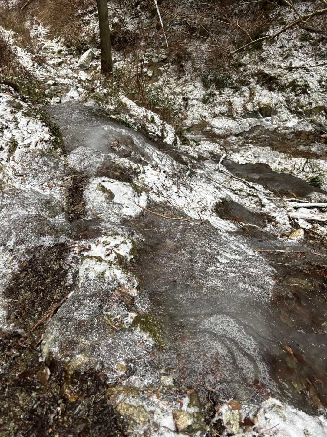 カトラ谷は至るとこがカチコチポイントだらけ💦 特に舗装路の上と、沢の中の岩の上に要注意🧊その他、斜面をトラバースしていくところに捕まるところがほとんどないところがあり、細心の注意が必要でした😅チェーンスパイクオンリーではやや不安かも。。。