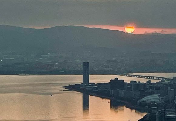 「日の出を長等山テラスから」の思いで、暗い内にスタートしました。時間が経つにつれて、山際の雲が気になり、残念ながら日の出は望め無いかも知れないと不安が過ぎります。テラスには先客が居られましたが、日の出までには少し時間があったので、先に三角点まで行って記帳を済ませて、再びテラスに戻って来ました。山際の雲にわずかな隙間が見えます。何とか日の出が見られそうです。比較的温かな朝で時間待ちも余り気になりません。やがて明るさが増し、太陽が出て来ました。真っ赤な大きな太陽です。ほんの一瞬でしたが顔を見せてくれました。登って来て良かったです。 往路では暗くて見えなかったですが早尾神社の参道の階段が綺麗に掃除されていました。清々しい気持ちで帰路につきました。