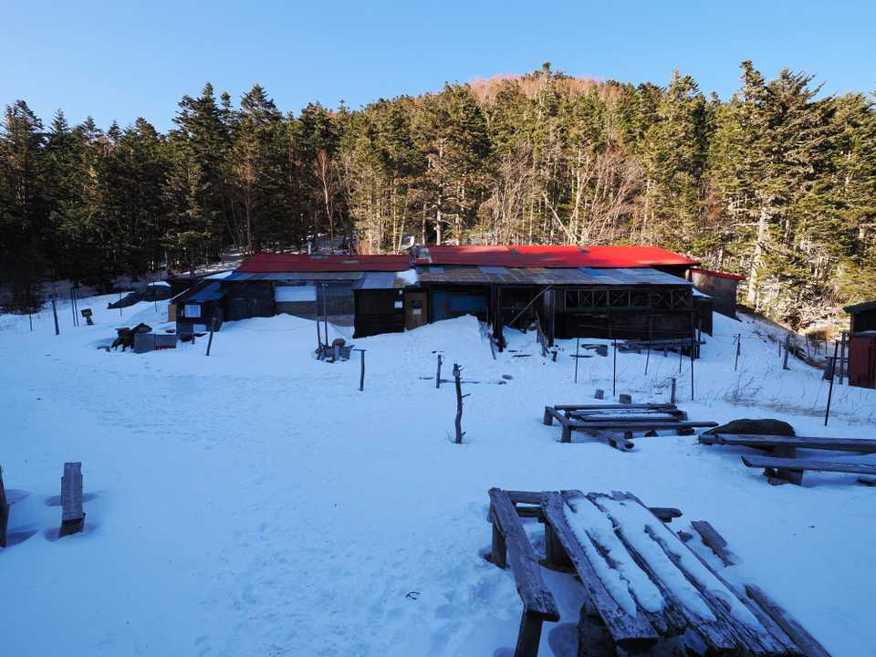 【アクセス】  夜叉神峠登山口駐車場からスタート。 【天気】  1日目 ☀️  2日目 ☀️ 【コース状況】  夜叉神峠登山口駐車場〜夜叉神峠 ちょっと登ると凍結箇所や雪あり。  夜叉神峠〜南御室小屋 標高を上げると雪が多くなってきました。しっかりとしたトレースがあり、チェーンスパイクを使用。南御室小屋の積雪は20~30cmほどか。  南御室小屋〜薬師岳 強風で雪が吹き飛ばされて無い箇所と吹き溜まりがあり。  南御室小屋からはアイゼンを使用。スノーシューやワカンは不要で、携行したピッケルの出番はありませんでした。 【感想/記録】  先週の三連休は、土曜日だけがお天気は良かったものの、強風予報だったので、山行は諦めて家に引きこもってしまいました。今週末の天気予報は晴れだけどまた強風予報でしたが、月曜日は何とか風が弱くなりそうな予報だったので、夜叉神峠から鳳凰三山へ、南御室小屋でテント泊して一泊で登る事に。 ■1日目  前日の9時に富山を出発しましたが路面に雪は無く、南アルプス市には15時過ぎにスムーズに到着しビジネスホテルに宿泊。  翌朝は7時半頃に出発し、夜叉神峠登山口には8時半頃に到着。駐車場には10数台の車しかなくて、がら空きでした。準備をして9頃に出発。まずは斜度が緩い登山道を登りますが、無風なので暑くてすぐにジャケットを脱ぎました。  夜叉神峠に到着すると快晴で白峰三山が見えました。ここの手前からは雪が積もってきたのでチェーンスパイクを装着して稜線伝いに登ります。穏やかな登山道は直ぐに急登となって、重いザックだと標高を上げていくのが大変。晴れた樹林帯の中でも風が吹いて、寒くなってきたので途中でジャケットを着ました。  登山道は樹林帯が続くので、白峰三山は樹々の間からチラッとしか見えないのが残念。途中のベンチに腰掛けて昼食のパンを食べましたが、さすがにじっとしていると寒くて、コーヒーで暖まりました。杖立峠に到着したらまた休憩。ここからは斜度が緩やかになり、辻山からはせっかく登ったのに下ります。  15時頃に南御室小屋に到着したら到着したら、誰もおらず貸し切りとなりそう。防風壁付きの豪華な居抜き物件があったので、これ利用したらテントの設営はすぐにできそう。でもその前に水を確保するために水場へ向かう途中に冬季小屋があり、中を覗くとゴザが敷いてあり毛布も完備されて快適そう。あっさり計画を変更して冬季小屋に宿泊する事に。早速小屋の中で着替えて荷揚げしたビールとワインで乾杯。  17時から夕食の準備を始めて、夕食のカレーを食べたら小屋の外で明日の天気予報を確認したらお天気は良さそう。小屋に戻ったらまた給水して、Amazon prime video を見たりして19時過ぎには寝ました。 ■2日目  3時半前に起床したらお湯を沸かして保温ボトルに入れてから朝食の準備。気温を確認したらは0.7℃ほどで暖かい。朝食を食べてからコーヒーを飲んで荷物を整理して、小屋の外に出てアイゼンを装着し準備を整えたらようやく5時半に出発。  御室小屋からはいきなり急登が続き息が上がります。トレースを追って標高を上げて、しばらく進むと斜度は緩やかに。最後に雪の急斜面を登るとようやく視界が開けて稜線に出ました。花崗岩の岩場を登ると砂払岳に出て、東の空を見ると赤く染まってきている。  一旦下り薬師岳小屋の横を通り、登り返すと薬師岳に到着。ピークでご来光を待つと、6時50分頃にご来光が昇りました。残念ながら北岳など白峰三山の南アルプスの山々は期待ほど赤く染まらず。それでも、美しいモルゲンロートの時間を堪能できました。  昨日よりも風は弱いものの、風速10m近くの強風が吹いており、観音岳の登頂は断念。山頂付近の風を避けられる岩陰でパンを食べてコーヒータイム。  薬師岳から下山し砂払岳を過ぎて8時半過ぎに小屋に到着。小屋に戻ったら荷物を整理して9時過ぎに出発。また重いザックを担いで苺平まで登り返します。あとは緩やかなトレースを小走りでドンドン下り杖立峠に到着。ここでパンを食べてからコーヒータイム。  夜叉神峠に到着すると昨日同様、快晴の空が広がっていました。夜叉神峠から緩い坂道を下って13時過ぎに駐車場に到着。無事にご来光が見られて遠征した甲斐がありました。 【注意点や反省点】  南御室小屋の冬季小屋の料金は2,000円。広さは8畳ほどで2人で使用。トイレは男女別の個室(洋式)が2つ。水場はまだ使えました。  夜叉神峠駐車場ではソフトバンクの電波は不通。南御室小屋では電波は不通ですが、ちょっと夜叉神峠方面に戻ると、かろうじて電波がつながりました。稜線上も市街地が見えそうな場所では電波がつながりました。  冬季小屋泊前提だったら、もっと荷物が軽くできました。 【Apple Watch等による計測結果】 ムーブ(安静時を越える推定エネルギー消費量 / kcal)   1,629   1,503 エクササイズ( 活発に活動した分数 / 分)   290   265 スタンド( 1時間のうち1分以上身体を動かした時間 / 時
