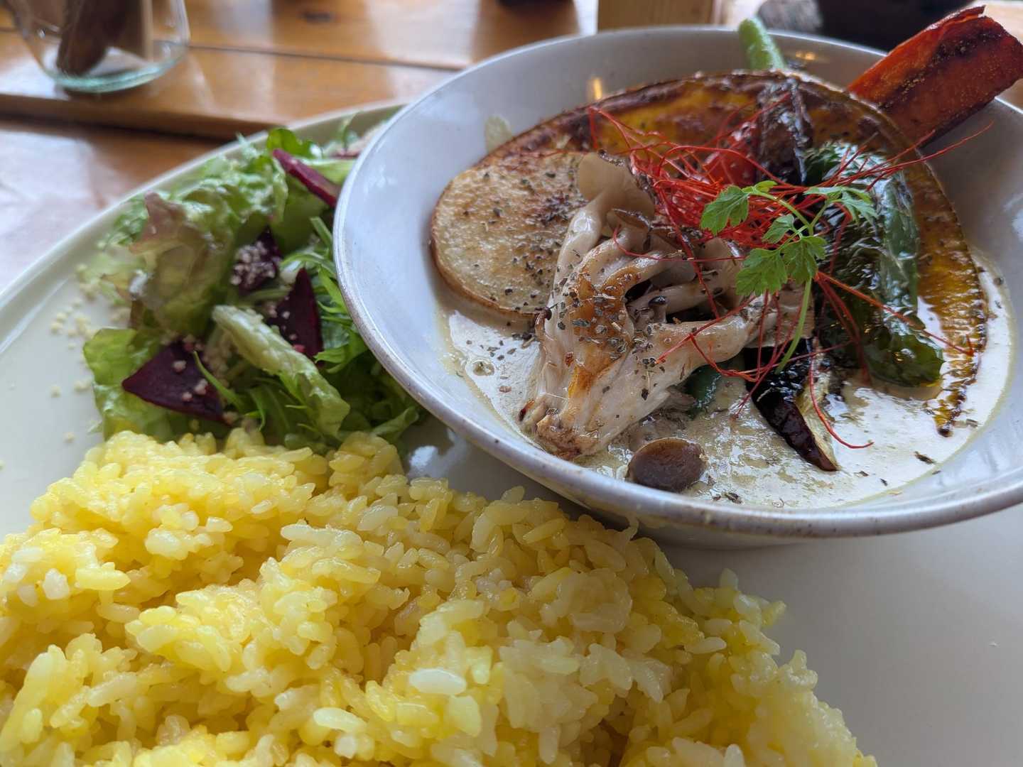 グリーンカレー食べました🍛 カレーとスィーツ、ドリンクのセットで2000円くらい。 のんびりできて お店の中も店員さんもとても雰囲気が良かったです⭕️ ここのパンはご主人様が仕込む天然酵母でてきていて、チャバタサンドも食べましたがお土産に買ったベーグルを食べるのが楽しみです✨️ お店の奥の棚に 自慢の?!酵母が並んでました✨️