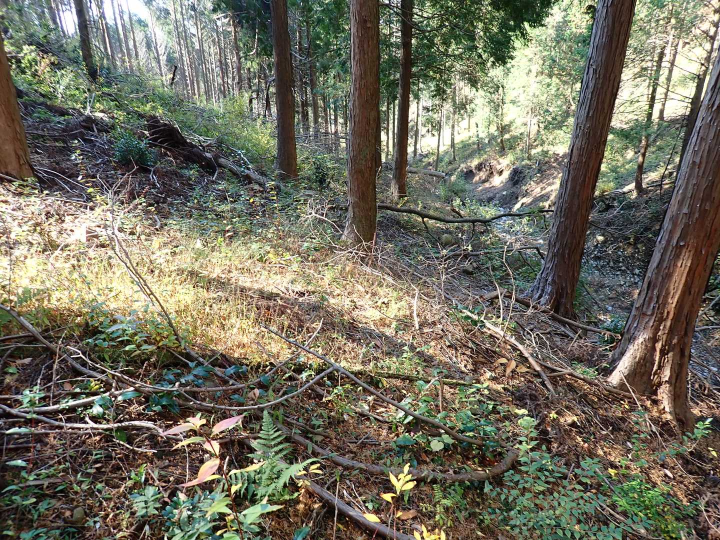落ち葉で踏み跡が薄くなっている道やスギとヒノキ林の激斜面を注意しながら下ると ややフラットな道 ホッとして見上げると時々紅葉。 この辺りに