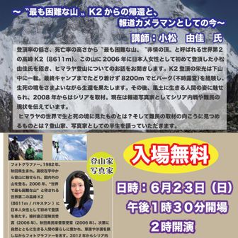 世界で最も過酷な山とされるK2に、日本女性として初登頂に成功したフォトグラファー登山家の小松由佳さん(1982年生れ、秋田県出身、2006年上村直己冒険賞受賞及び秋田県県民栄誉賞受賞)の講演会が、来る6月23日(日)14時開演(13時30分開場)熊本県大津町生涯学習センター(文化ホール)にて開催されます。入場無料、先着500席、駐車場有。当日は、K2登山での過酷な体験談や、フォトグラファーとして取材を行ったシリア内戦と難民の現状をお話し頂けます。写真家として、登山家として、母としてヒューマニズム溢れる小松さんの講演会へ是非お越しください。多くの皆様のご来場をお待ち致しております。