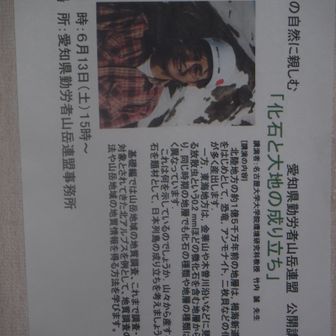 愛知県勤労者山岳連盟の運営する登山講座です。2020年3月開講。 安全に楽しく登山を楽しめるように基礎的な知識や登山技術を学びます。 講座が5日、実技山行が3日です。 問合せ、申し込みは愛知労山、aichirousan@gmail.com まで。 Faxでの送付は052-691-7783(案内チラシの番号を変更しました。) 講座の内容。 3月28日(土) 講座①[山に登る前に]――山に登る姿勢と装備・食糧 講座②[山の天気]――天気図の見方、山の天気の予測の仕方を 学習します。気象予報氏による講座です。 4月11日(土)[地図の読み方使い方。]地図と磁石は山登りの基本です。 地形図の読み方、使い方を学びます。 5月16日(土) 講座④[登山の計画と安全。]登山計画と計画書の作成、山行中の危険 予知と対策を学びます。 講座⑤[危険個所の通過。]危険個所の通過、ロープワークについて 学びます。 5月23日(土) 講座⑥[山での病気・怪我。] 山での病気・怪我と、その対処方法について学びます。 6月13日(土) 講座⑦[山の自然に親しむ。] 山の岩石を見て、山々の成り立ちの不思議、違いを学びます。 地質学専門の研究者である名大教授の講座です。 15時開始、参加費500円です。 ――その他、山岳会についても講座を持ちます。 実技山行 4月5日(日)まず、山に登ってみよう。 4月12日(日)地図読み山行。金華山の周遊コース。磁石と地図の使い方を実地に行い、 山座同定しながらミニ縦走を楽しみます。 5月17日(日)鈴鹿、ロープワークと、危険個所の通過の仕方を練習します。