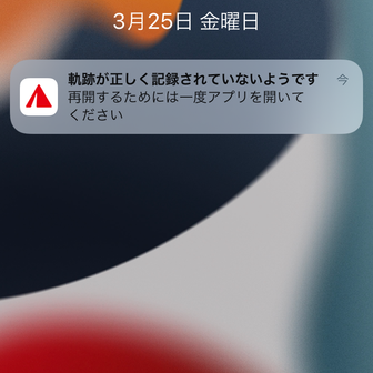 - YAMAPぱぴこさん、お問い合わせいただきありがとうございます。 YAMAPカスタマーサポートです。 最近、軌跡がきちんと取れないとのことでご迷惑をお掛けして申し訳ございません。 また、以下などの軌跡に関する記事をご一読いただいたとのことありがとうございます。 [現在地や軌跡が正しく取れない場合は?(iPhone)] https://help.yamap.com/hc/ja/articles/900000916086 [【iOS】活動中の軌跡が稀に飛ぶ現象に関して] https://info.yamap.com/archives/3620 上記記事などでご案内いたしておりますが、位置情報に問題が生じている場合は、機器の一時的な不具合や設定に問題があると思われます。 主に以下のようなことが原因となり、YAMAP側では改善することが非常に困難な領域となっております。 ・GPSチップの精度、故障 ・衛星からの電波が届きにくい環境 ・メモリ不足などにより端末に問題が生じた場合 など >対策が「こまめにヤマップアプリを開く」事のようですが、今までと今との違いはなんなのでしょうか? (回答) 一般的に、iPhoneではアプリがバックグラウンド(スリープまたはアプリを閉じている状態)の場合は、強制的にアプリが終了されることがあり、活動中にYAMAPアプリが強制終了されると、その間は軌跡が取れなくなります。 こちらは、OSの正常な動作であり、YAMAPだけではコントロールできるものではありません。 YAMAPを開く頻度を高めることで、バックグラウンドでの強制停止が起こりにくなるため、少しでも軌跡飛びを予防するためにご案内させていただいております。 >あとこの問題は永遠に解決しないのでしょうか? (回答) YAMAPでは、各スマートフォン端末に内蔵された「GPSチップ」が捉えた位置情報をそのまま活用しております。 位置情報に問題が生じる場合は、各端末やGPSチップの精度、その他GPSに影響を及ぼす設定等が原因となりますので、YAMAPアプリでは完全に解決ができない領域となります。 また、OSの動作につきましてもYAMAPだけではコントロールできるものでは無いため、現状では完全に解決することが難しい見込みです。 今後もアプリの修正や軌跡飛びを予防するためのご案内、軌跡飛びを減らすための取り組みを行ってまいります。 >新しい山であればこまめに地図を確認しますが行きなれた山であればあまり確認することは無いですし、カメラは別で撮るためスマホを開くことも少ないです。 加えてマスク等をしながら登山をする方々もいると思いますので余計に直感的な操作が出来ない環境下でこまめに見ることを忘れてしまったり億劫になってることかと思います。 景色よりスマホに気を取られて大事な瞬間を逃してしまうことになりかねない問題だと思うのでどうか改善策が打開策をお願いします。 重いことでアプリが弾かれるなら軽量モード等の機能を開発してもらえればいいのかなとも思います。 (回答) 貴重なご意見をいただきありがとうございます。 いただいたご意見は、今後の開発の参考とさせていただきます。 すでにご存知の場合は大変恐縮ですが、最後に取得した軌跡の位置から120m以上先までに、GPSから精度の高い座標を取得できなかった場合には、添付画像のようなプッシュ通知が送られます。 プッシュ通知音を聞こえるようにしていただくことで、活動中に確認がしやすくなるかと存じますので、お試しいただけますと幸いです。 また、これまでメモリ不足を抑えるための修正などは行なってまいりましたが、引き続き調査・修正を行なってまいります。 こちらのご案内にて、全て解決することは難しいかと存じますが、YAMAP側としましてもこちらの問題は重要な課題として認識しており、改善に向けて取り組む所存でございます。 どうぞよろしくお願いいたします。2022.05.02(月) 08:21