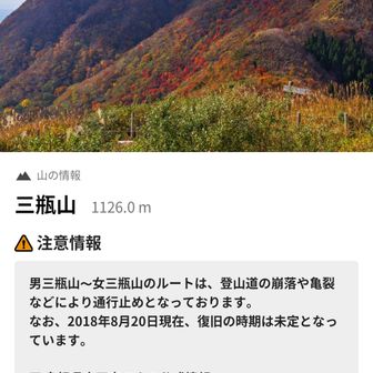 - YAMAP冬景色さん、ご返信ありがとうございます。 解除された登山ルートに関しまして点線で表示をいたします。 対応まで今しばらくお待ちいただけますでしょうか。 表示の区分に関しては以下のヘルプセンターに記載がございますので、ご一読頂けますと幸いです。 [YAMAPの地図について] https://yamap.com/help/docs/77 また、地図の詳細ページを下記の文言へ変更いたしました。 【注意】地震により男三瓶山から女三瓶山の間は、崩落や亀裂があり危険な状況であるため通行止めでしたが、現在は解除されています。 但し、引き続き崩落・滑落等の危険が伴う箇所が複数ありますので、自治体が発信する情報をご確認ください。 https://yamap.com/maps/300 どうぞ宜しくお願いいたします。2020.06.10(水) 08:43