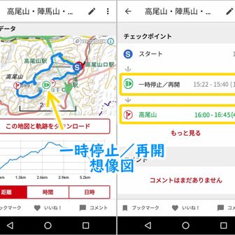 YAMAPの軌跡ログに「一時停止/再開」した位置情報と日時を記録し、「活動日記」の軌跡やコースタイムに表示できるようにして欲しいです。そうすればチェックポイントでない場所で長時間休憩したような場合でもコースタイムを正確に表示できます。GPSログは拡張可能なXML形式ですので、独自のタグを追加できるのではないかと推察いたします。「一時停止/再開ポイントを表示する」オプションで選択可能にすれば、従来の表示方法と共存できるのではないでしょうか。添付した画像のようなイメージです。