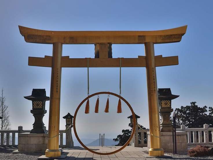 奥の社務所で御札を授かり、鳥居で記念写真