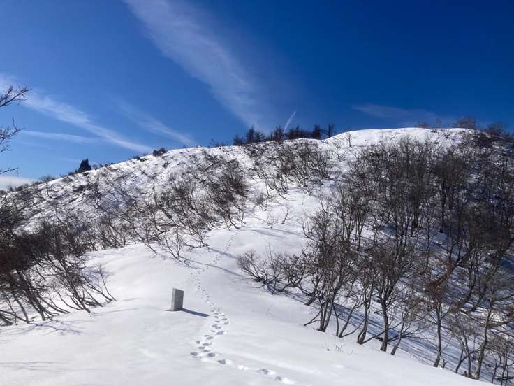 通常のコースで行くのは断念し、ちょっと遠回りして山頂へ向かうと、村岡側からの登山者が残したスノーシュー跡を発見。