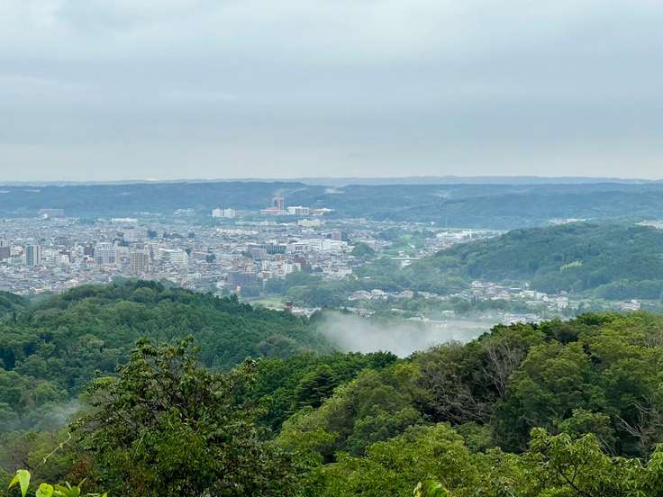 義経が何度も振り返って眺めたという絶景。奥武蔵、秩父の山々。山並み中央の奥、笠雲の下に微かに富士山。写真だとほとんど見えませんが😅