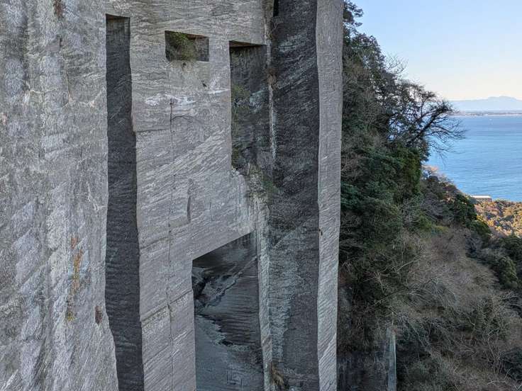 地獄覗きです。房州石を切りだした跡の出っ張ったスリルある絶壁です。
