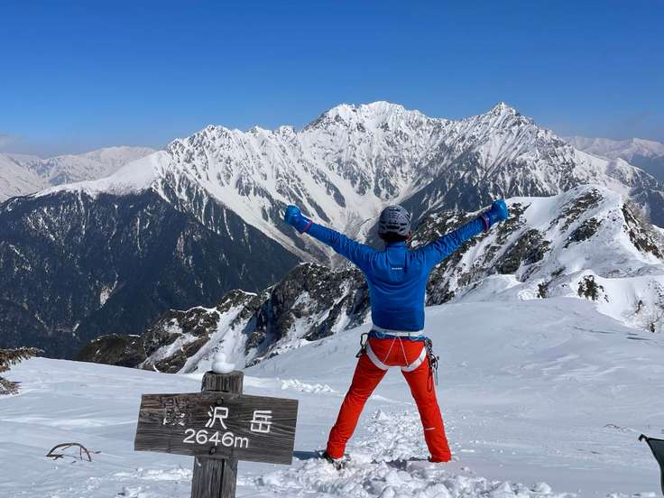 霞沢岳🏔️ 目の前には穂高ドーン! 西穂〜ジャンダルム〜奥穂〜前穂 ふげー!(凄いの最上級) 上下マムートおじさん🟦🟥 自分で見ても派手だなって思ってますよ😑