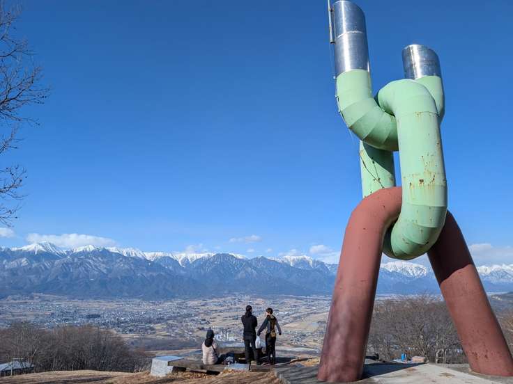 長峰山山頂のオブジェと北アルプス。
