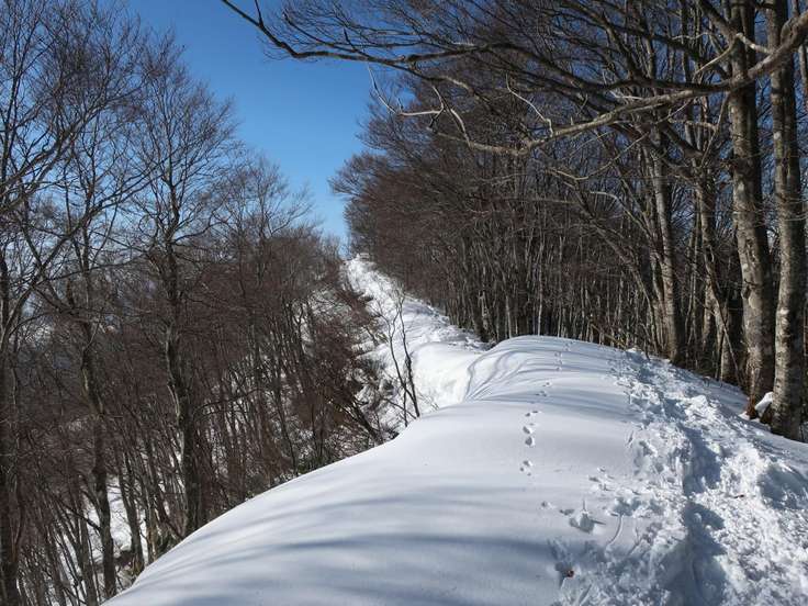 行きに写真取りそこねた、登山道への取次。雪壁の左にルートあり