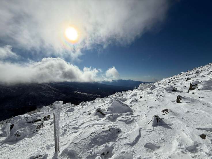 麓まで降りてきましたが、まだお昼頃なので南斜面の霧氷も残っていました。