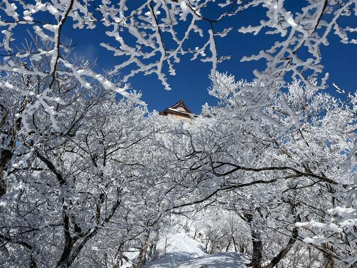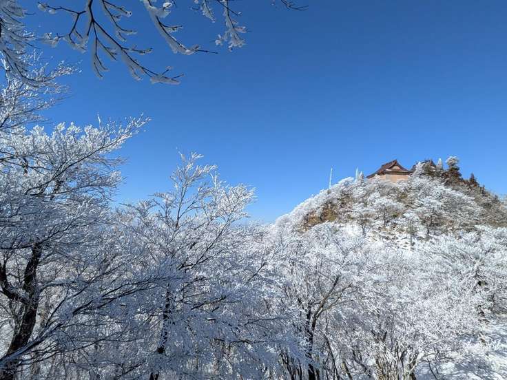 霧氷の奥に上宮が見える。