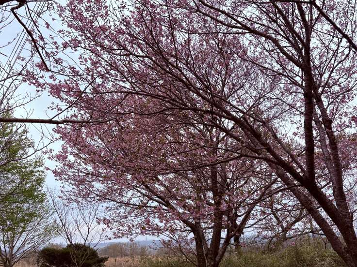 宝篋山を望む。下山後に分かったのですが、白い樹木はサクラではなくコブシです。