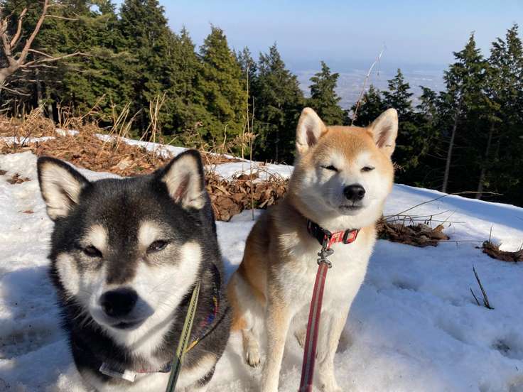 柴犬花と海と。池田山でプチ雪歩き