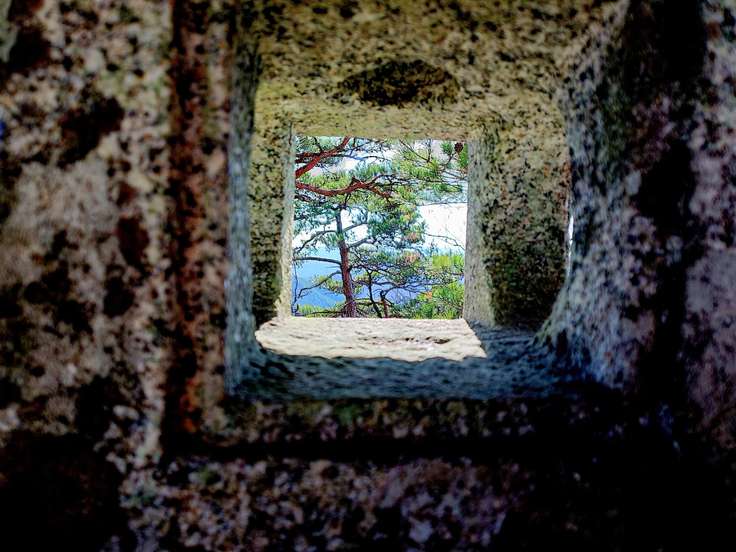 虎捕山山頂は林の中の緩やかな尾根道にある。眺望なし。風がなければ休憩は眺望のよい本殿上の岩場がおすすめ。