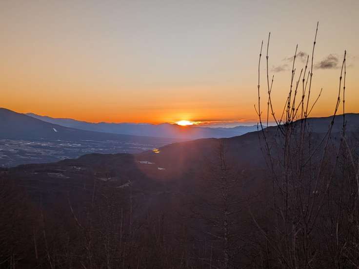 八ヶ岳の右手の辺りが赤くなってきましたが、残念なことにワタクシが去年初日の出を拝んだ赤岳には雲がかかっています☁️ 初日の出はちゃんと見れたのか気になります☹️
