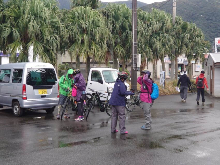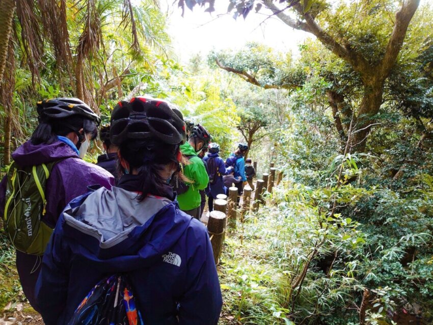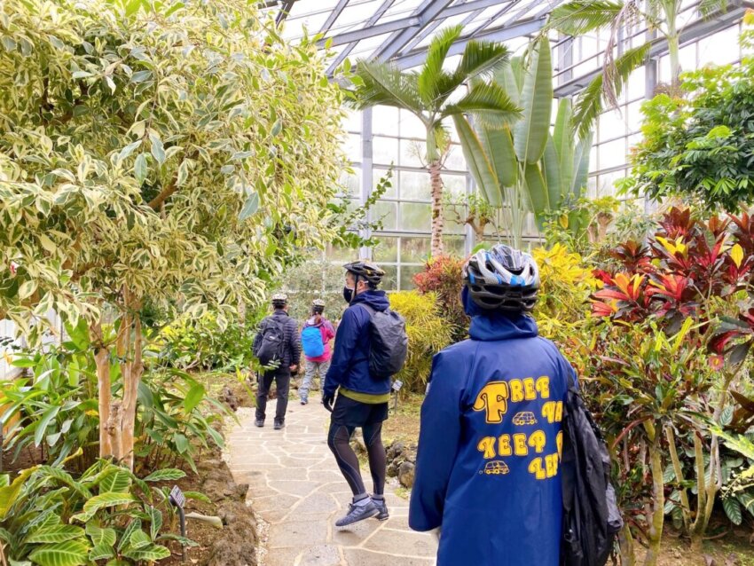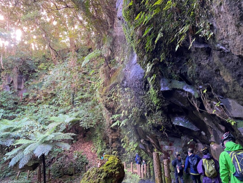 準備が整ったところで、いよいよ出発。今日は三原山の裾野をE-BIKEで巡ります。昨日の八丈富士と並んで、八丈島を代表する活火山です。朝の澄み切った空気の中、E-BIKEで木のトンネルを駆け抜けます。まさにマイナスイオン吸いたい放題。