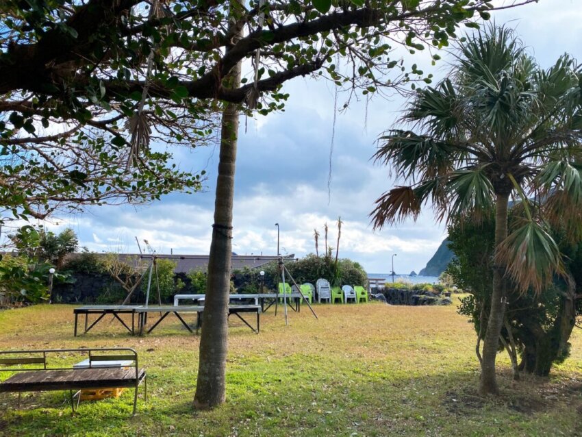 翌朝の天気は真っ青な快晴。泊まった場所は、庭に大きなガジュマルの木がある「そこど荘」という民宿です。お風呂にもゆっくり浸かり、布団でぐっすり眠ることができました。