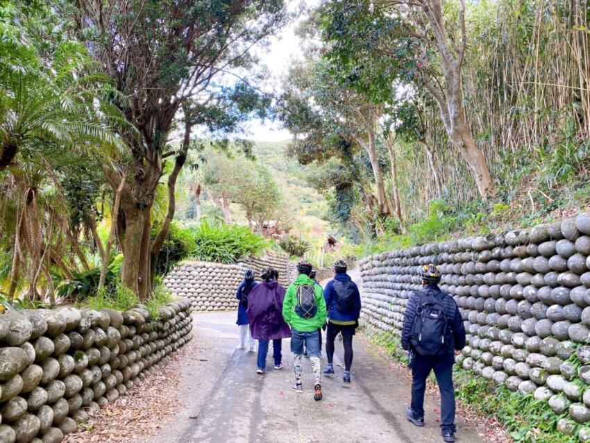 島の文化を学んだところで、次に向かったのは玉石垣が続く大里集落です。卵型の白っぽい石で構成される玉石垣は防風林と同様の役割をもち、古くは室町時代に作られた歴史あるもの。前崎の浜に転がっている丸い石を手で一つずつ運んで積み上げ、隙間を島の土で作った粘土で固めています。台風が多い島の気候でも、滅多に崩れないほど強度があるそう。