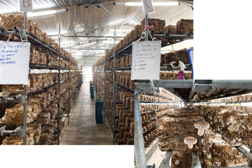 想像よりもはるかに広いファーム内には、椎茸の菌床がぎっしりと置かれた棚がいくつも並んでいます。適度な湿度と温度が保たれているため成長が早く、生えてきてからなんと1週間で食べ頃を迎えるそう。