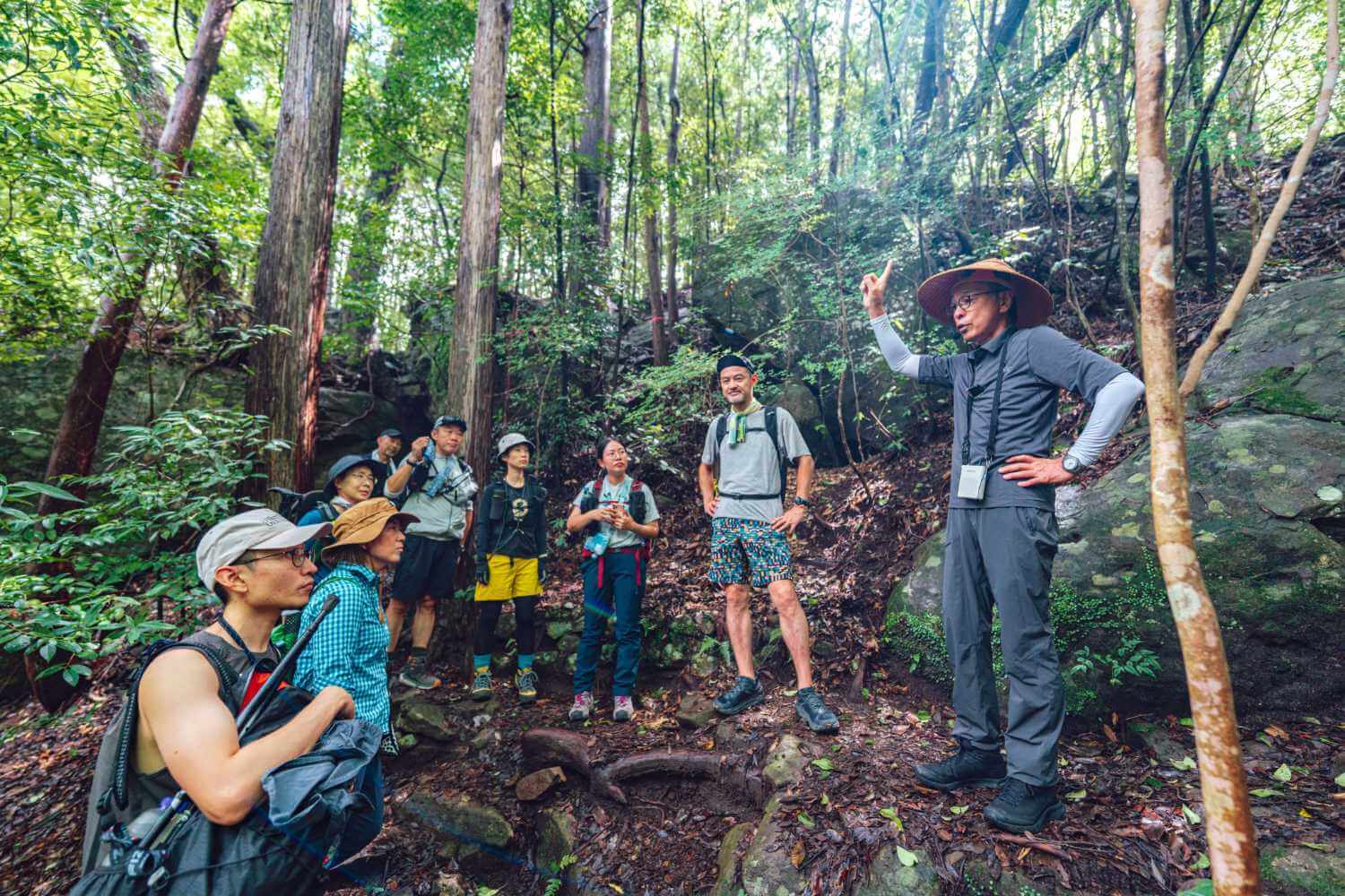 準備体操したのち、さっそく一行を迎えるのが急登。そう、滝尻〜高原コースの最初にして唯一の難所が出だしのそこそこ長く続く登り道なのです。筆者もかれこれ4度目でしたが、わかっていてもやっぱりしんどい。かろうじての救いは樹林帯のしっとりとした涼しさでしょうか。