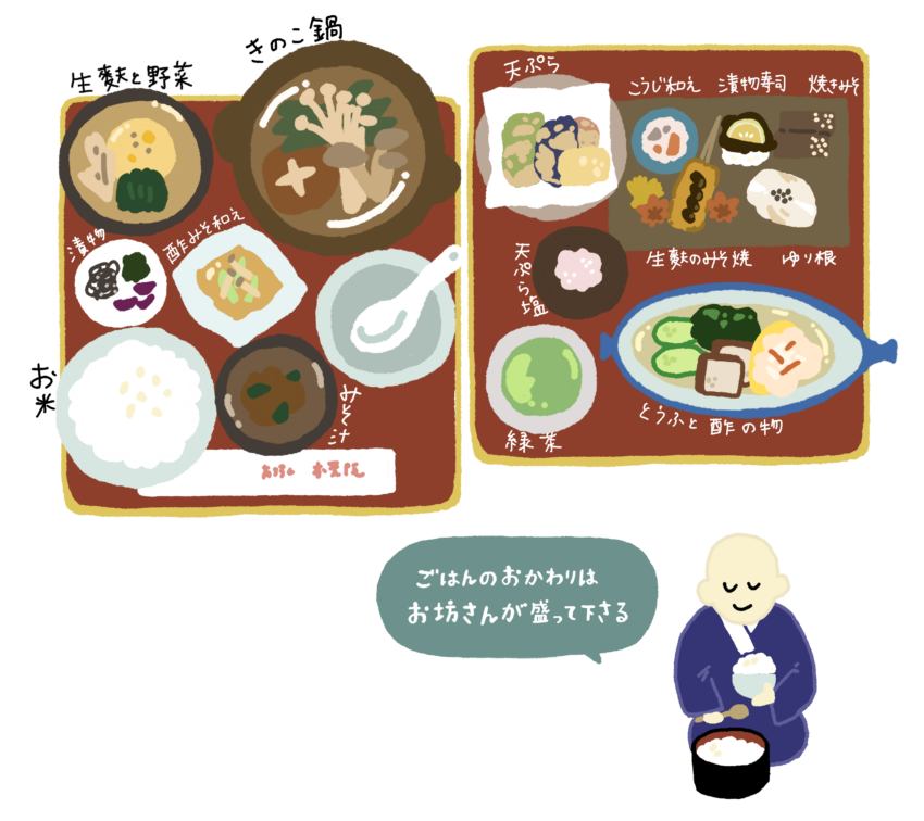 ご飯はしっかりおかわりもできて、おなかも心も満たされた。途中で挨拶に来てくれた副住職さんの、控えめでやわらかい人柄も印象的だった。