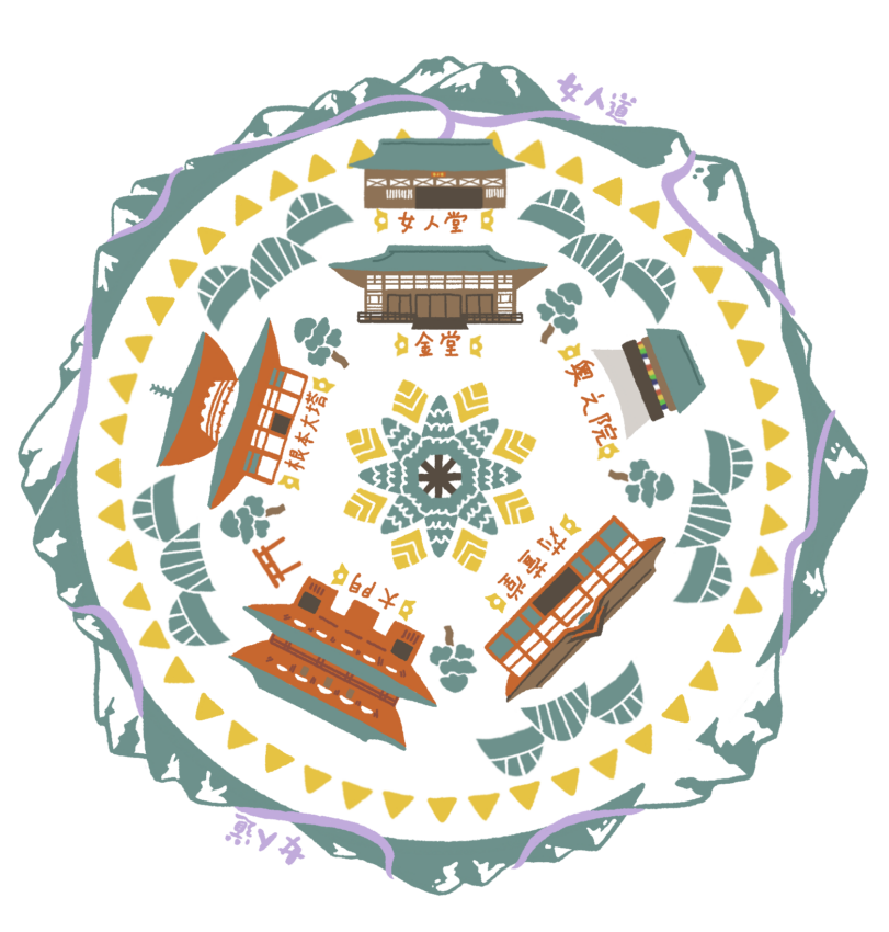 高野山は街全体で一つの宗教世界を作り上げている。街をぐるりと取り囲むように女人道が走る