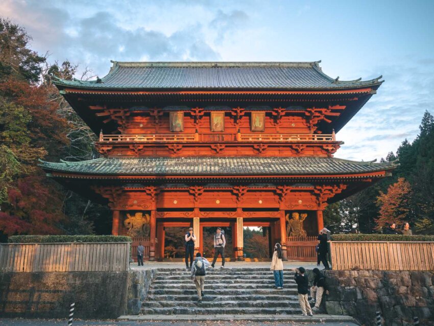高野山の入り口に立つ「大門」だ。西に向かって立つ巨大な門は、ちょうど夕日を全身で浴びていて、朱色の柱がさらに濃いオレンジに輝いている。いままで見たどんな歴史的建造物よりも、圧倒的に荘厳で、凄まじい存在感。