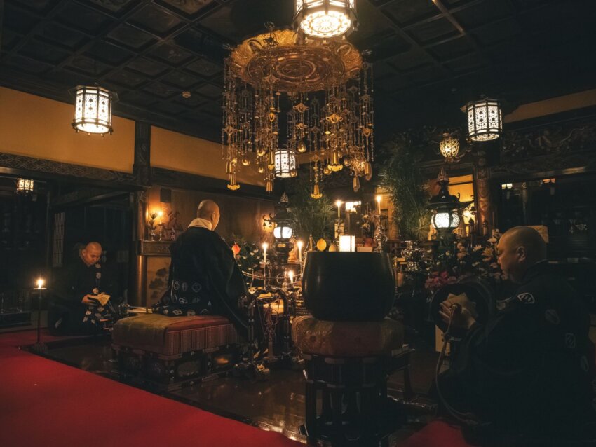 読経が始まると、お坊さんたちの声がほとんど振動のような低い波になって本堂を満たしていく。後頭部と横顔のシルエットだけが見えるお坊さんたち。その向こうで揺れるろうそくの火。線香の香り。