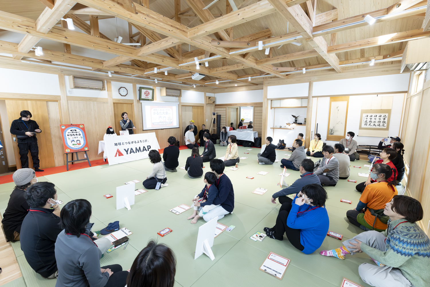 正直、最初は会議室みたいなところでこぢんまりとやるんだろうなあと想像していたら、そこは畳敷きの立派な武道場だった。別の場所に来てしまったかと思ったが、畳の上にはかるたの拡大パネル、横断幕、そして結構な数のYAMAPスタッフが。まだ一回目の大会なのに、すでに「何かの名人戦か?」と思うほどの本格感だった。このかるたを通じて、なんとか安全登山に繋げていきたい──というYAMAPの本気度に、改めて凄みを感じたのである。