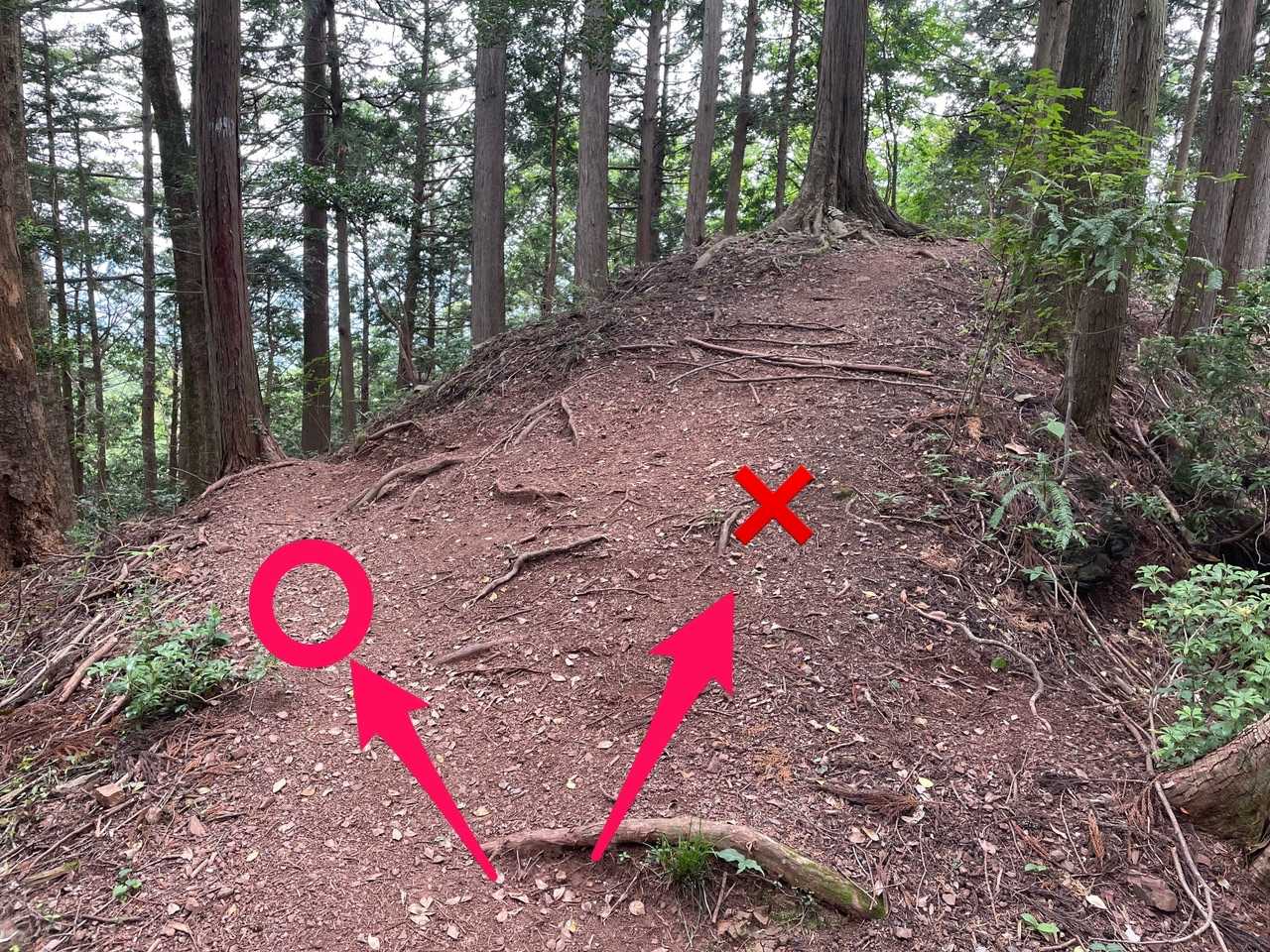 六ツ石ノ頭を過ぎて子の権現方向へ向かう途中。尾根に道があるように見えますが、そのまま尾根沿いに歩くと道をはずれます。正解は左です。
