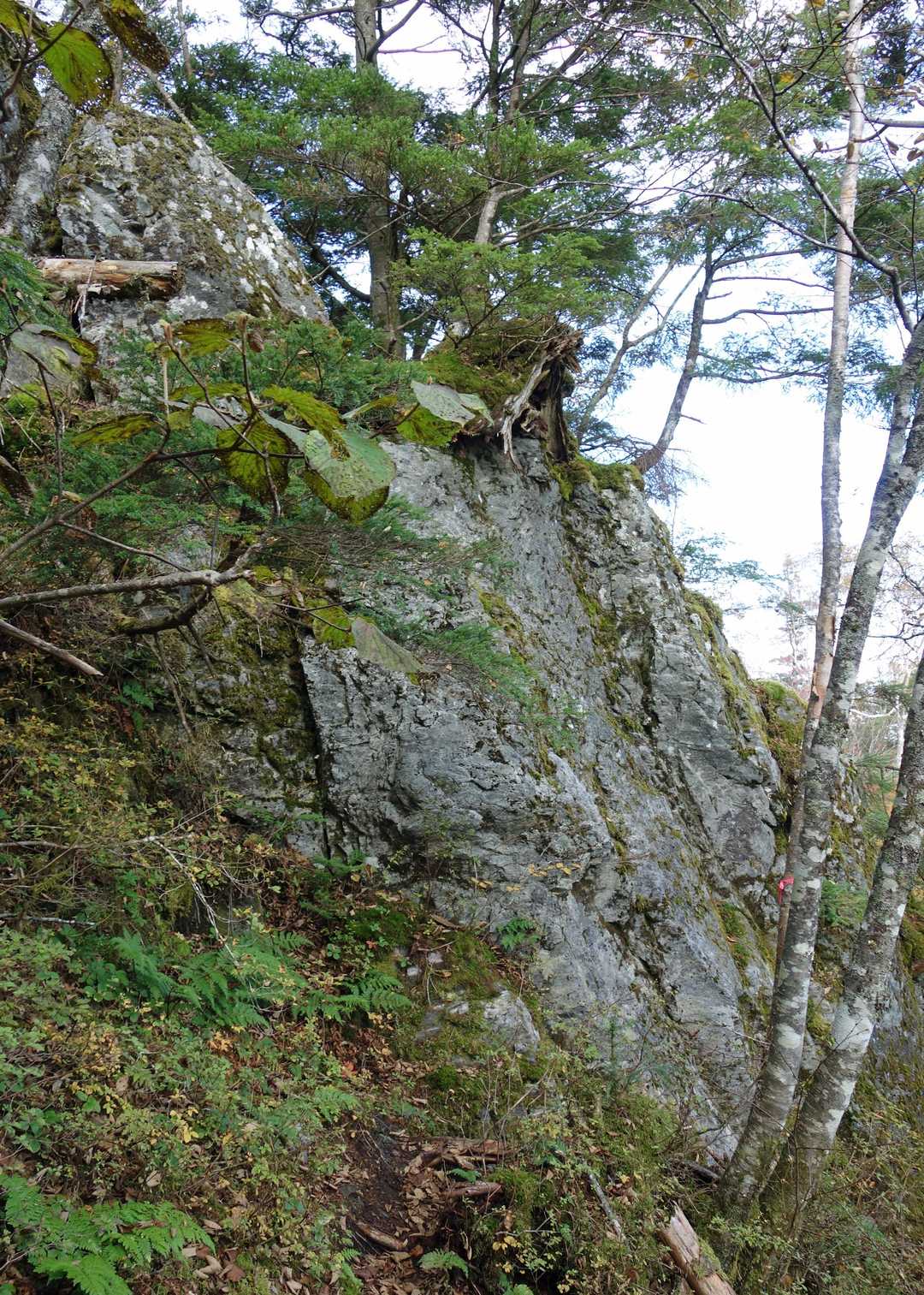 岩場コースと迂回コースがある。 岩場は巨岩を巻いて渡る、コース中いちばんの難所。地質は堆積岩系の変成岩であり、割ともろい。しかし、足元を確実に見極め、手で補助的に保定すれば問題ない。