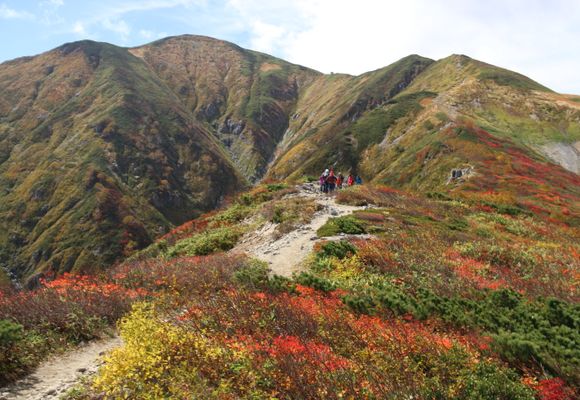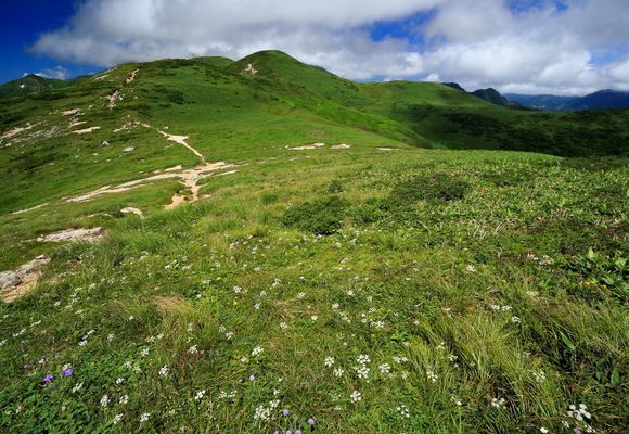 鳥海山は秋田と山形の県境に位置し、標高2,236mは福島の燧ヶ岳(標高2,356m)に次ぐ東北地方第2位の高峰である。裾野を広げる秀麗な山容から、「出羽富士」とも称される。中央火口丘の新山をはじめ、行者岳、七高山など多くの寄生火山をもつ複式火山で、過去幾度となく起こった噴火により変化に富んだ地形ができあがった。その周囲にはニッコウキスゲに彩られる火口湖や雄大な雪渓など、この山の魅力を増幅させる要素が詰まっている。数ある登山道のうち、西面の鉾立バス停から御田ヶ原経由、南面の滝ノ小屋登山口から心字雪経由のコースがよく歩かれる。山頂直下に山小屋があるが、営業期間が短いので注意(山中はテント泊不可)。