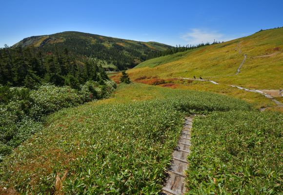 新潟県魚沼市と群馬県みなかみ町の境界にあり、昭和40年代に入って初めて登山道が開かれた秘峰。山頂には花咲く高層湿原が広がり、池塘越しに眺めるパノラマもすばらしい。とはいえ、登るのはたいへんだ。桧枝岐村側からの鷹ノ巣コースは往復の純歩行時間が11~12時間。途中に山小屋や避難小屋はなく、山頂にあったテント場も近年、緊急時以外は利用禁止になっている。つまり、このコースタイムで日帰り必須なのだ。ヘッドランプやツエルトなどは必ずにザックに入れておき、さらに日の短い秋の登山は避けるべきだろう。最近は魚沼市側からの中ノ岐コース(往復約6時間)がメインコースとなりつつあるが、登山口への送迎は山麓の宿の宿泊者限定などの条件があるので注意したい。