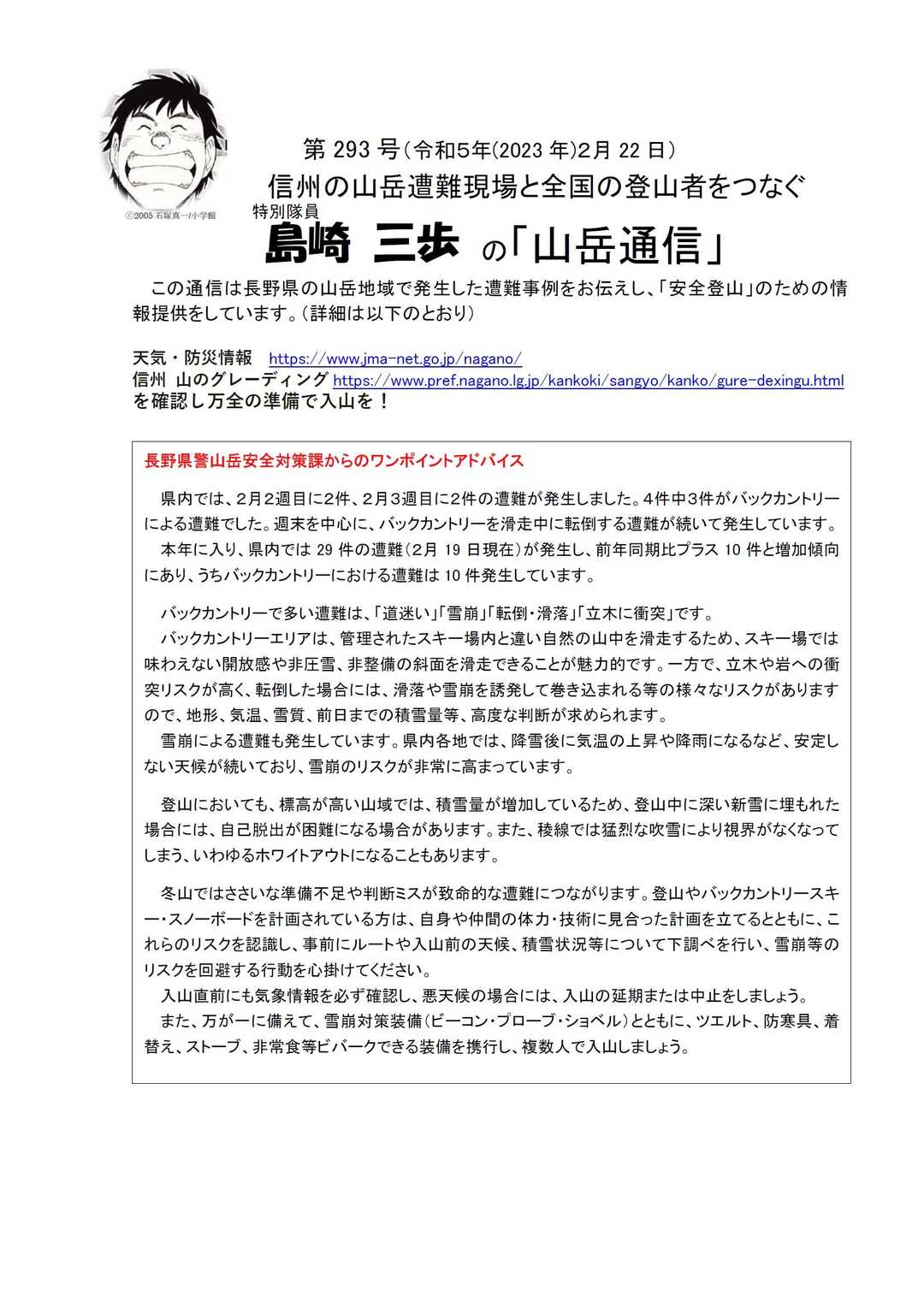 ◎山岳遭難発生状況(週報) ・2月6日、志賀高原の横手山スキー場外において、スノーボードでバックカントリー滑走をしていたニュージーランド国籍の男性(47歳)が、雪が深く身動きが取れなくなる山岳遭難が発生し、志賀高原地区山岳遭難防止対策協会救助隊員が出動して救助しました。 ・2月11日、北安曇郡小谷村の虫尾沢において、6人でバックカントリーをスノーボードで滑走していた男性(50歳)が転倒し、負傷して行動不能となる山岳遭難が発生し、大町警察署山岳救助隊、北アルプス北部地区山岳遭難防止対策協会救助隊が出動し、救助しました。 ・2月18日、5人パーティで北安曇郡小谷村の白馬乗鞍岳天狗原付近において、バックカントリーをスキーで滑走中の女性(55歳)が、転倒して負傷し、行動不能となる山岳遭難が発生し、捜索を行いました。翌19日、大町警察署山岳遭難救助隊、警察本部山岳遭難救助隊及び北アルプス北地区山岳遭難防止対策協会救助隊が出動して、救助しました。 ・2月18日に5人パーティで松本市安曇の上高地にアイスクライミング目的で入山した男性(48歳)が、翌19日、下山中に雪崩に巻き込まれ負傷する山岳遭難が発生し、松本警察署山岳遭難救助隊が出動して救助しました。 ○令和5年2月19日現在の遭難状況は 29件(死者5人、行方不明2人、負傷者13人、無事救出17人)となりました。 前年比は、発生件数が+10件、遭難者が+12人です。 内)単独登山は、発生件数が+5件、遭難者が+5人です。 内)バックカントリーは、発生件数が+4件、遭難者が+7人です。 ★長野県警山岳安全対策課からのワンポイントアドバイス 県内では、2月2週目に2件、2月3週目に2件の遭難が発生しました。4件中3件がバックカントリーによる遭難でした。週末を中心に、バックカントリーを滑走中に転倒する遭難が続いて発生しています。 本年に入り、県内では29件の遭難(2月19日現在)が発生し、前年同期比プラス10件と増加傾向にあり、うちバックカントリーにおける遭難は10件発生しています。 バックカントリーで多い遭難は、「道迷い」「雪崩」「転倒・滑落」「立木に衝突」です。 バックカントリーエリアは、管理されたスキー場内と違い自然の山中を滑走するため、スキー場では味わえない開放感や非圧雪、非整備の斜面を滑走できることが魅力的です。一方で、立木や岩への衝突リスクが高く、転倒した場合には、滑落や雪崩を誘発して巻き込まれる等の様々なリスクがありますので、地形、気温、雪質、前日までの積雪量等、高度な判断が求められます。 雪崩による遭難も発生しています。県内各地では、降雪後に気温の上昇や降雨になるなど、安定しない天候が続いており、雪崩のリスクが非常に高まっています。 登山においても、標高が高い山域では、積雪量が増加しているため、登山中に深い新雪に埋もれた場合には、自己脱出が困難になる場合があります。また、稜線では猛烈な吹雪により視界がなくなってしまう、いわゆるホワイトアウトになることもあります。 冬山ではささいな準備不足や判断ミスが致命的な遭難につながります。登山やバックカントリースキー・スノーボードを計画されている方は、自身や仲間の体力・技術に見合った計画を立てるとともに、これらのリスクを認識し、事前にルートや入山前の天候、積雪状況等について下調べを行い、雪崩等のリスクを回避する行動を心掛けてください。 入山直前にも気象情報を必ず確認し、悪天候の場合には、入山の延期または中止をしましょう。 また、万が一に備えて、雪崩対策装備(ビーコン・プローブ・ショベル)とともに、ツエルト、防寒具、着替え、ストーブ、非常食等ビバークできる装備を携行し、複数人で入山しましょう。