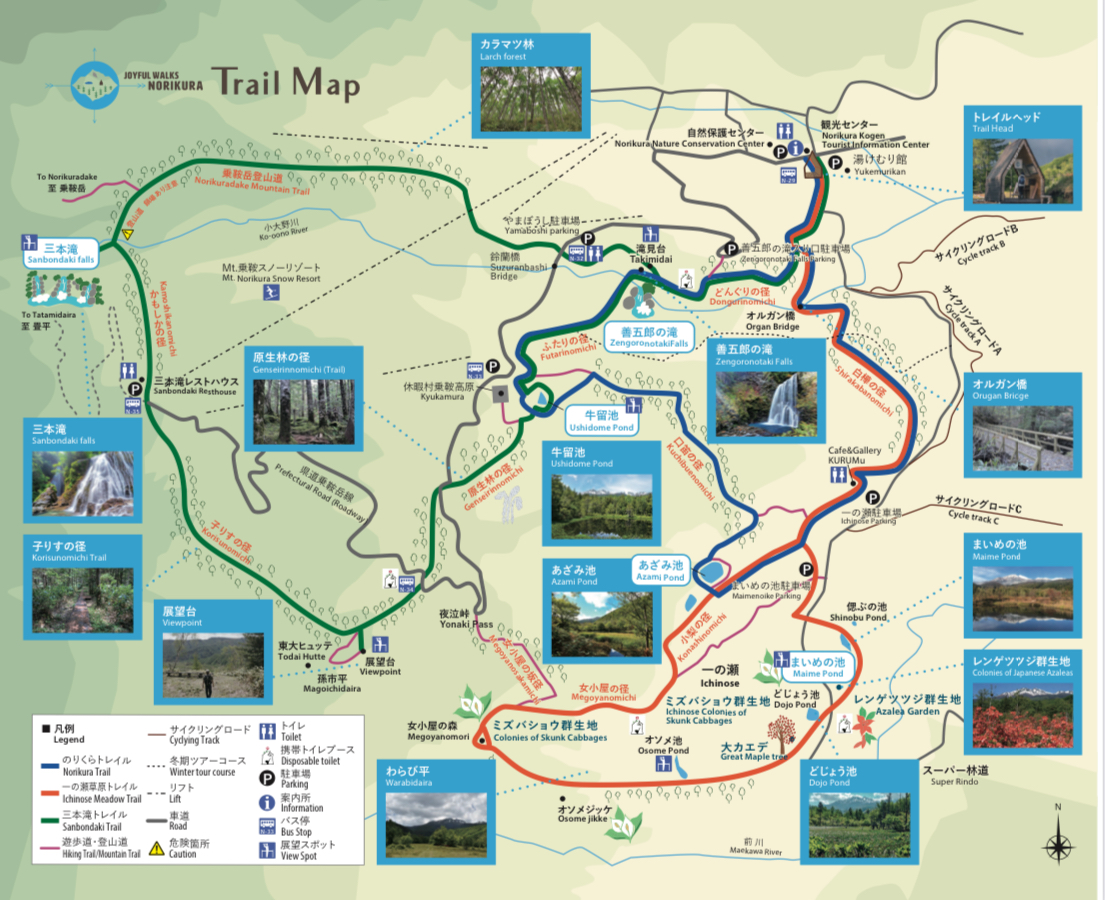 さらに、高低差が少なく、子どもから大人までのんびり歩ける一の瀬草原や、乗鞍岳の噴火で流れ出た溶岩の上に広がるダイナミックな番所大滝、ミズナラと白樺の明るい森を進んだ先にある善五郎の滝、針葉樹林帯を渡った先にある三本滝など、魅力的なトレイルが揃っています。